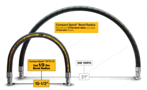 Düşük Radüs ; Uygulama yeri dar olduğu zaman, büküm yarıçapı da dikkate alınması gereken önemli başka bir unsurdur. Parker, SAE standartlarında belirtilen basınç sınıfları için talep edilen büküm yarıçapının, yarısına sahip hortumları ürün gamında bulundurmaktadır. Bu hortumlar %50 daha düşük büküm yarıçapına sahip olmasının yanında %33 daha az efor sarf edilerek bükümü sağlanabilmektedir.